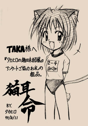 紅堂 熾烈さんから頂いたです。 本HP初(笑)の、ねこみみメイドですッ!! メイドファンにはたまらない一品であります♪♪ |