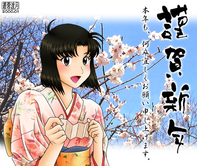 私の唯一の感謝の気持ちの表現として、皆様のお目汚し程度ではございますが、 年賀CGを描き上げました。 自動車業界に籍を置きます私は、どうしても年末は多忙になりますので CGを書ける時間が少なく、今一つ満足できるようなものではないのです・・・・ 人物像と背景になんら接点がなかったり、着物の柄や色塗りがお粗末だったり・・・ 本当にお目汚しとなってしまいました。 来年は、悔いの残るような絵は描かないように致します(^^ゞ By叢雲渡月さん お粗末・・? そんなことはございません、すばらしい限りですよ 私が以前作ったヘボ絵に比べたら・・・月とすっぽん、 いや・・ゴルフボールぐらいの差がありますし(汗) By駅長 このイラストは2000年の年賀CGでした |